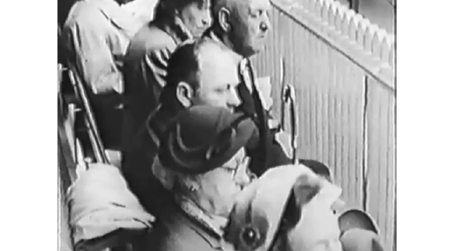 Indenrigs- og boligminister Aksel Møller taler ved indvielsen af det nye rådhus 9. maj 1953. Aksel Møller var medlem af Frederiksberg Kommunalbestyrelse 1937-1958. Han var borgmester 1948-1950 og 1954-1958. Fra "Rådhusfilmen".