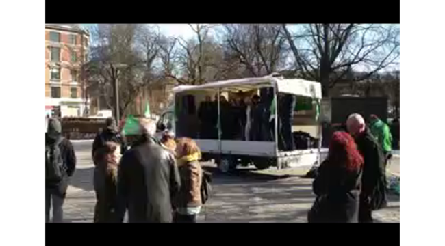 Lockoutede frederiksbergske lærere forsamlet på pladsen foran Frederiksberg Rådhus 2. april 2013. Lærerkoret synger en alternativ version af Beatles-klassikeren Yellow Submarine. Videoen er optaget med iPhone.