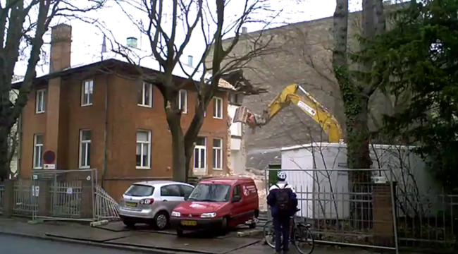 Nedrivningen af den røde villa på hjørnet af Frederiksberg Allé og Platanvej (Frederiksberg Allé 41) fortsættes 13. januar 2010.
