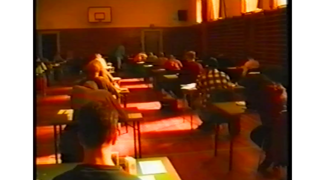 Optagelser fra de skriftlige eksamener på Frederiksberg Gymnasium 1995. Gymnasiet holdt på dette tidspunkt til på Niels Ebbesens Vej. Klippet varer 0.45 min.